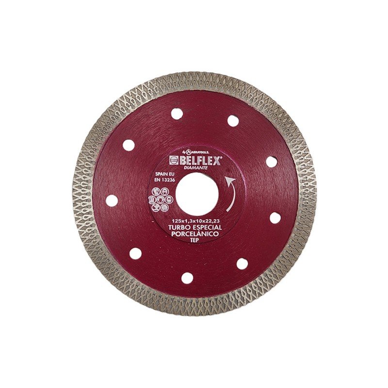 Disco de diamante turbo especial porcelánico Belflex, diseñado para cortes precisos y rápidos en materiales duros como Silestone, azulejos, gres porcelánico, mármol y granito. Ofrece alta durabilidad, refrigeración eficiente y un acabado limpio, ideal para trabajos profesionales en construcción y reforma