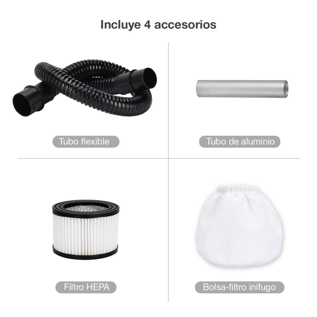 Aspirador de cenizas Dubie 800W Longitud cable (M): 1.5m Diámetro (mm) (Ø): 250 Hz: 50/60 Incluye 4 accesorios: Tubo de aluminio, tubo flexible y un filtro HEPA, y una bolsa-filtro inifúgo. Filtro HEPA: Sí Capacidad (ml): 10000 Con Bolsa-filtro de tela inífuga Funciones: Soplado y aspiración