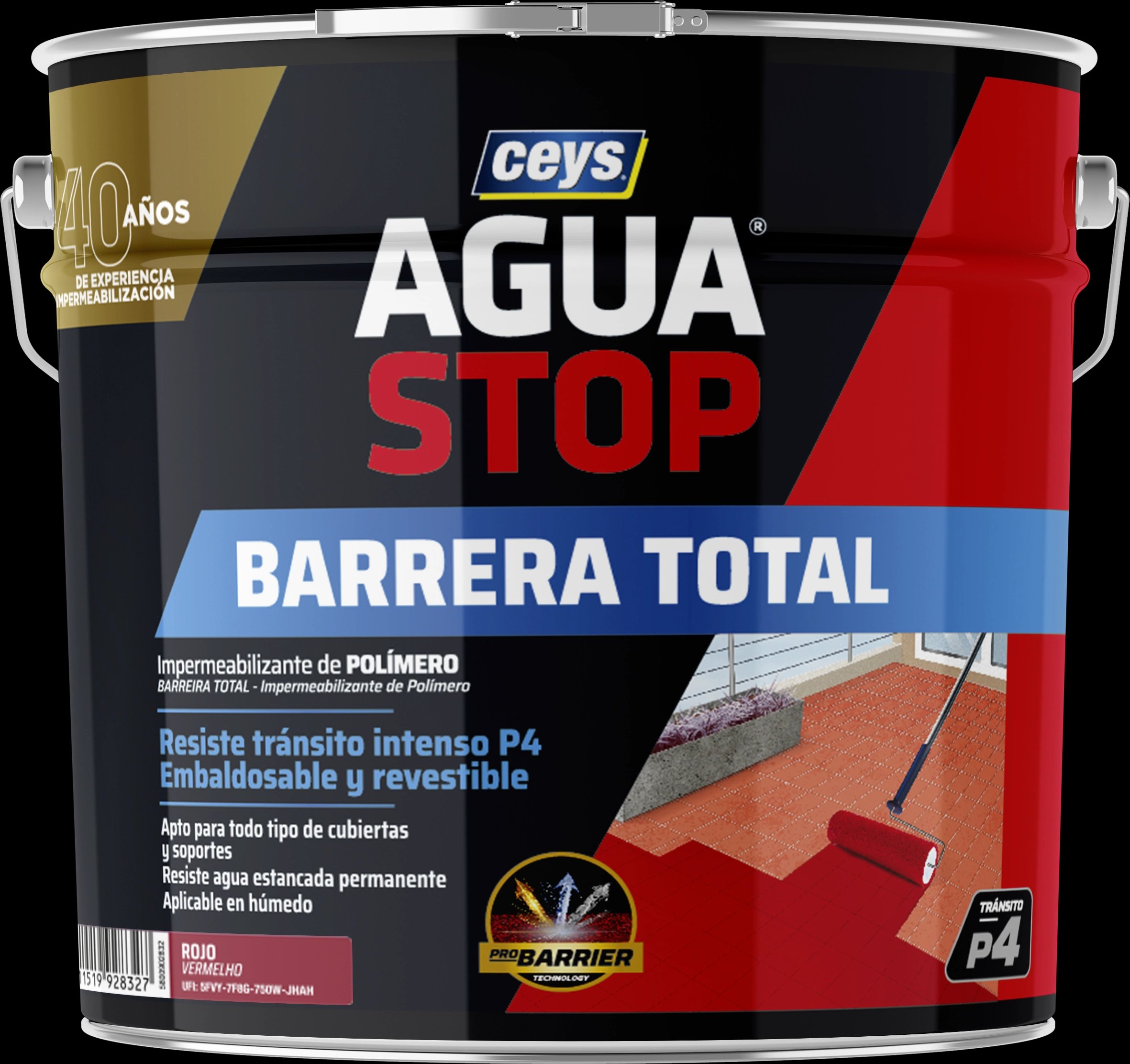 AGUASTOP BARRERA TOTAL es una membrana impermeabilizante transitable para trabajos de impermeabilización de todo tipo de superficies. La tecnología TOTAL WATERPROOF le confiere una resistencia extrema a la radiación UV, a las inclemencias meteorológicas y al tránsito peatonal diario. Pudiéndose, gracias a esta extrema resistencia, alicatar. COLOR: ROJO Características · Resiste lluvia las 4h de aplicación · Agua estancada · Aplicable en húmedo (<25%) · Gran adherencia · Revestimiento continuo: sin juntas ni uniones · Elástico: soporta los movimientos del soporte · Apto para el contacto con agua potable Cumple criterios de calidad del agua para el consumo humando establecidos en el RD140 para elementos de la construcción según UNE-EN 12873-1:2004. Apto para embaldosar según EN 14891:2012 Aplicaciones Trabajos de impermeabilización en: · Terrazas o cubiertas planas con o sin tránsito · Cubiertas con riesgo a estancar agua. · Cubiertas a alicatar y duchas de obra. · Depósitos, cubetos, jardineras o aljibes · Encuentros entre tejado y paredes verticales